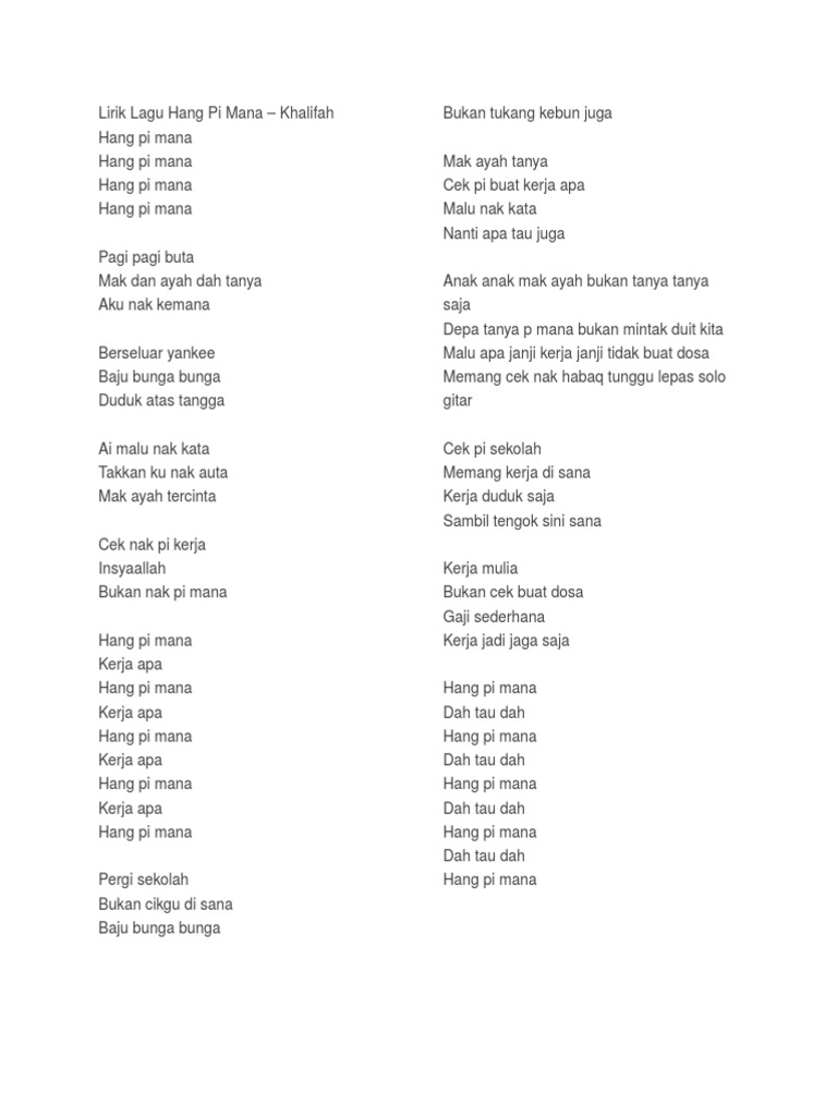 Lagu Hang Pi Mana Khalifah. Maret 27 2018 Tambah Komentar Edit. Verse 1 Em Pagi pagi buta mak ayah dah tanya Bm Aku nak kemana Am Berseluar yankee baju bunga bunga Em Duduk atas tangga verse 2 Em Ai malu nak kata takkan ku nak auta D Mak ayah tercinta C Ceq nak pi kerja D Insyaallah Em Bukan nak pi mana.